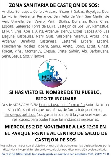 Desde Mos Achudem, también queremos agradecer a la Dra.Calderero todo su esfuerzo, su trabajo y coraje, lamentamos que haya terminado con tan triste despedida en vez de ser puesta en valor por su esfuerzo y dedicación. Y por supuesto agradecer y animar al resto de trabajadores del Hospital Barbastro, porque si el momento no es fácil para l@s pacientes, tampoco para quienes desarrollan su trabajo en condiciones no óptimas. Nos parecen problemas complejos y de no fácil solución, pero entendemos que para encontrar una solución primero hay que ser consciente de que hay un problema. Y tras todas nuestras conversaciones, tenemos claro que diversas partes son conscientes de ello, pero no todas.